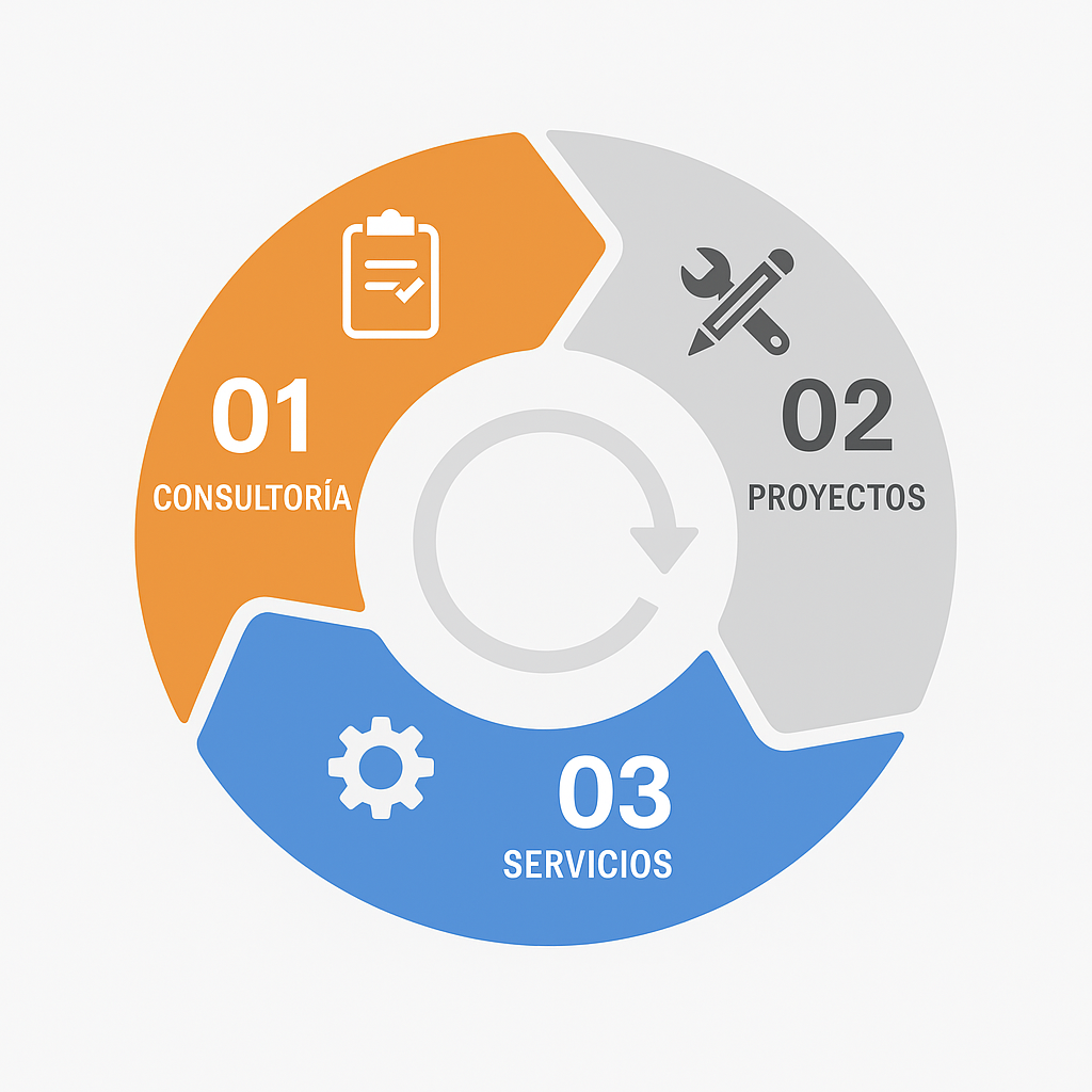 | 02 | Proyectos | Diseño y ejecución de soluciones tecnológicas adaptadas a cada negocio. |
